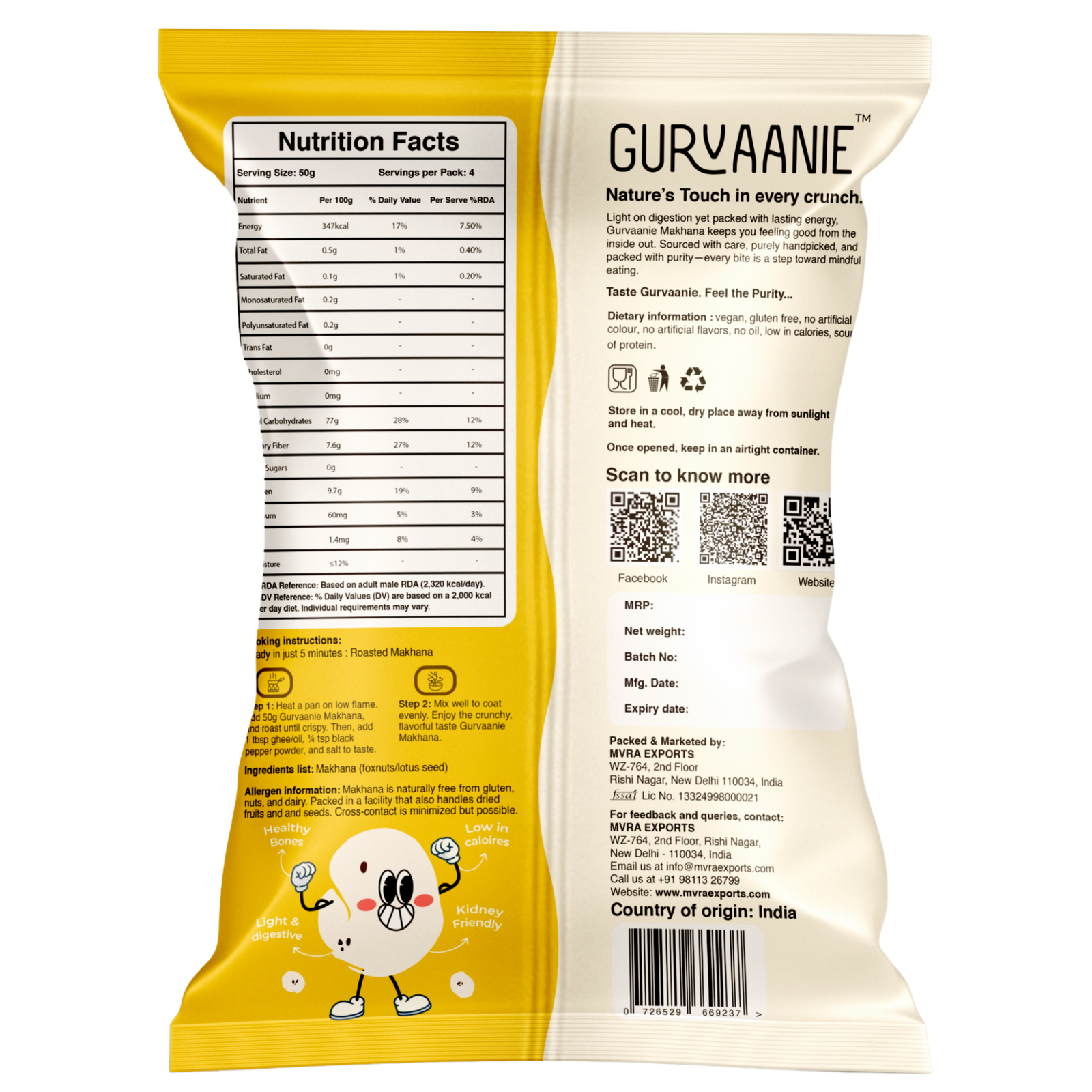 | Ingredients | 100% Pure Organic Makhana (Foxnuts) – A healthy Indian packaged snack |